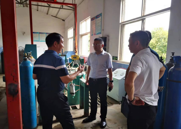 在许昌祥中气体科技有限公司,项红光详细了解气瓶充装、气瓶检验、安全阀校验、报废瓶处理等工作流程,现场查看了气瓶充装区、气瓶储存区、气瓶检验区、安全阀检验室等区域及设备的安全管理情况,仔细查阅了特种设备安全管理和作业人员证、气瓶、压力容器等特种设备的检验报告、使用登记证、特种设备安全总监和安全员任命文件等资料内容。要求企业加强气瓶使用安全管理,严格按照特种设备安全技术规范要求规范操作流程,充分发挥特种设备安全总监、安全员作用,确保各项安全管理制度落细落实。