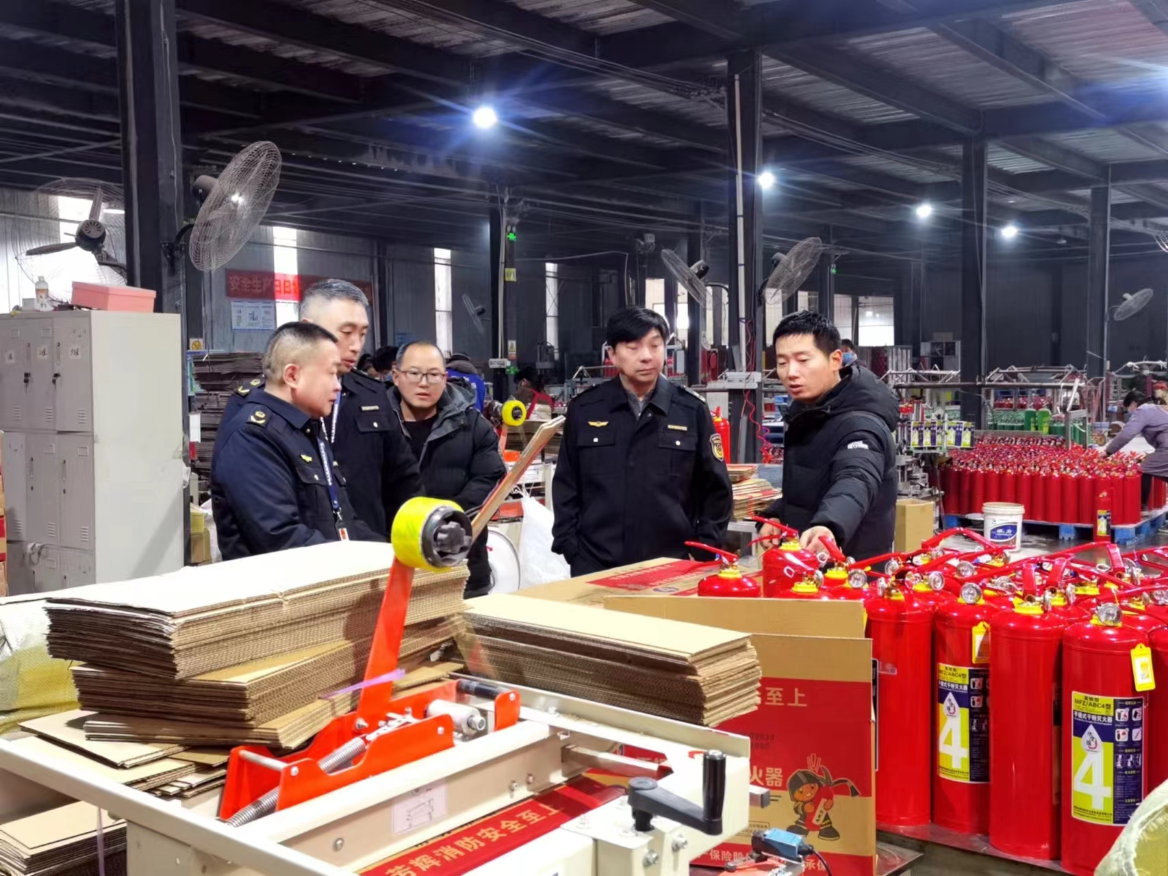 督导组从市场准入、产品质量、包装标识、台账记录、人员密集场所消防安全隐患排查四个方面入手,重点检查了企业生产的灭火器等消防产品的认证证书、技术鉴定报告、质量合格证明以及型式检验报告情况,企业是否建立消防安全管理制度、生产场地消防通道是否通畅并设置明显逃生指示标志等内容。