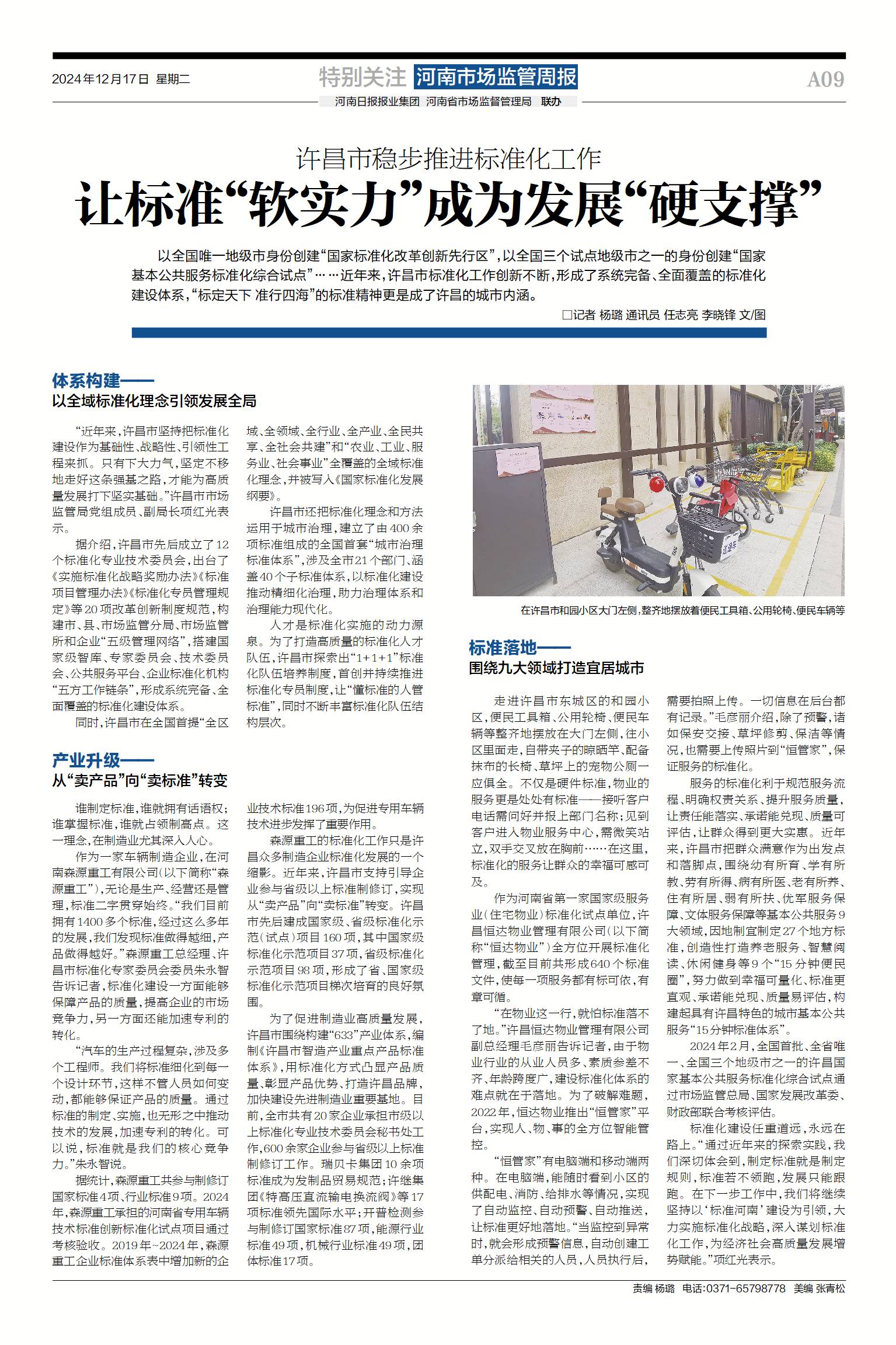 森源重工的标准化工作只是许昌众多制造企业标准化发展的一个缩影。近年来,a片动画 支持引导企业参与省级以上标准制修订,实现从“卖产品”向“卖标准”转变。a片动画 先后建成国家级、省级标准化示范(试点)项目160项,其中国家级标准化示范项目37项,省级标准化示范项目98项,形成了省、国家级标准化示范项目梯次培育的良好氛围。