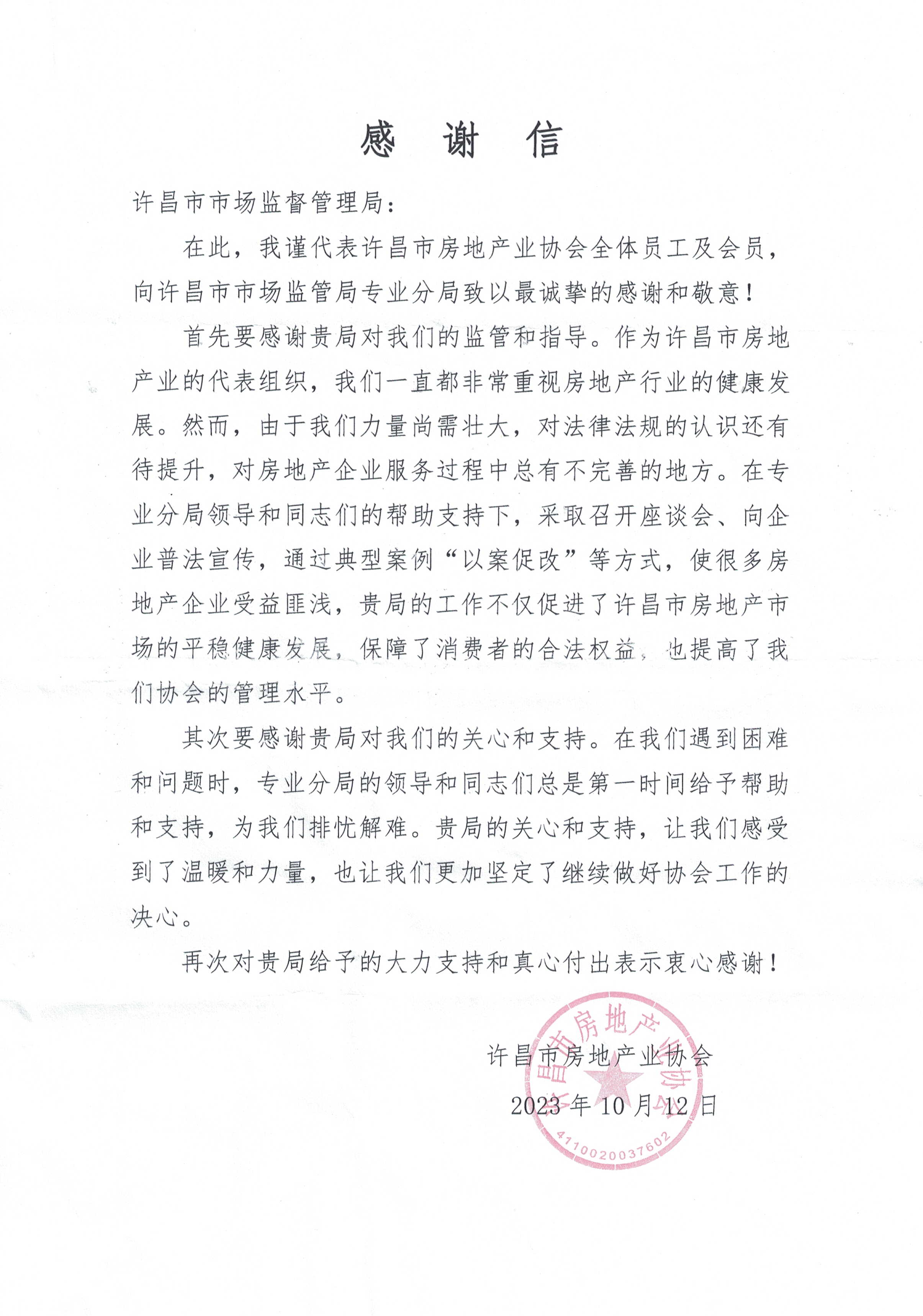 市市场监督管理局收到市房地产业协会赠送的感谢信